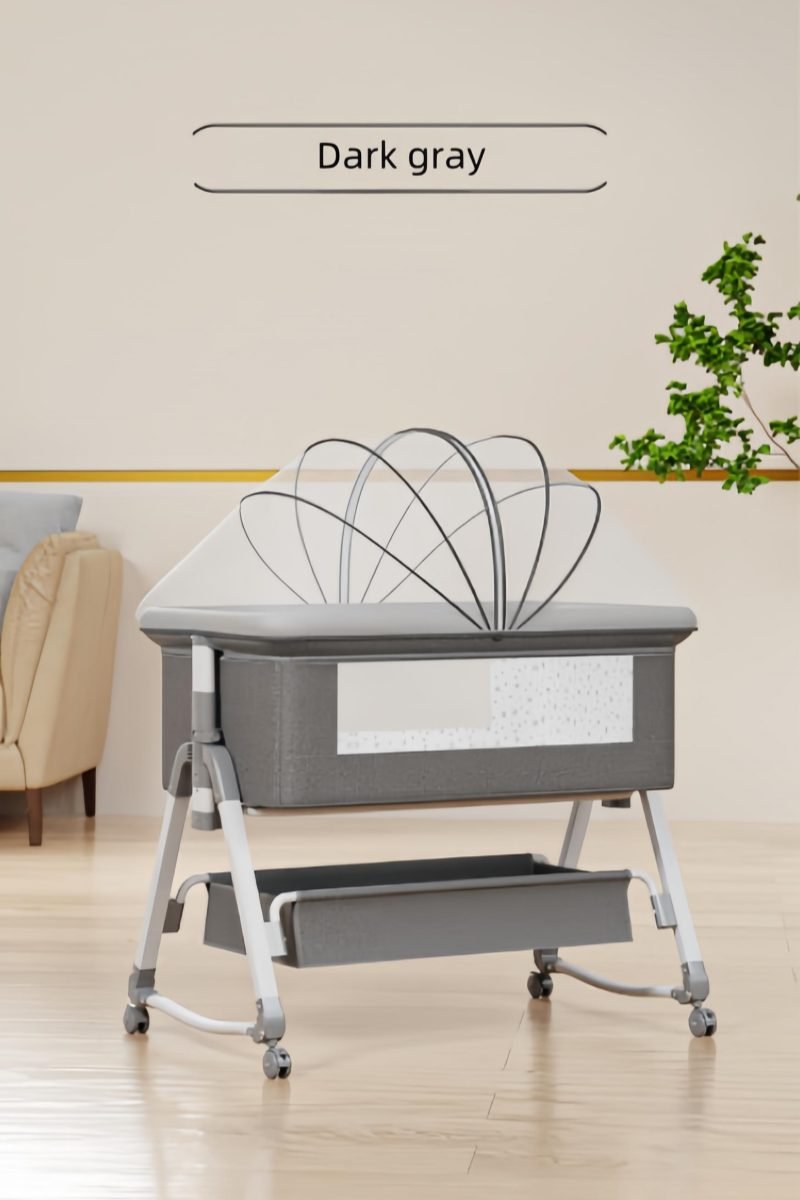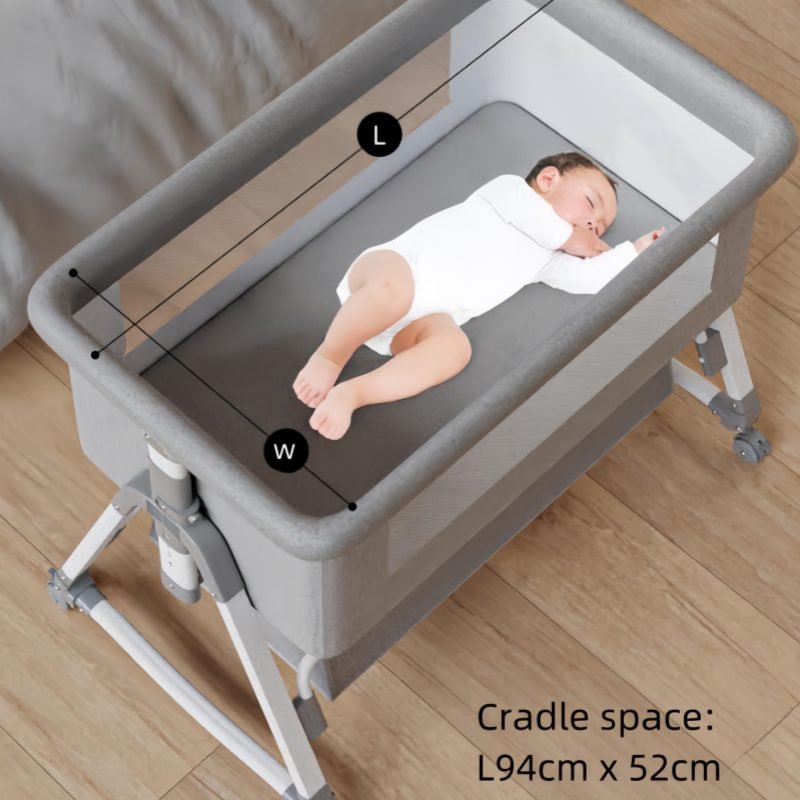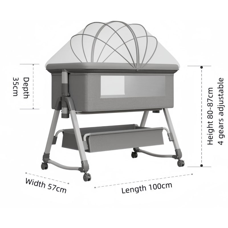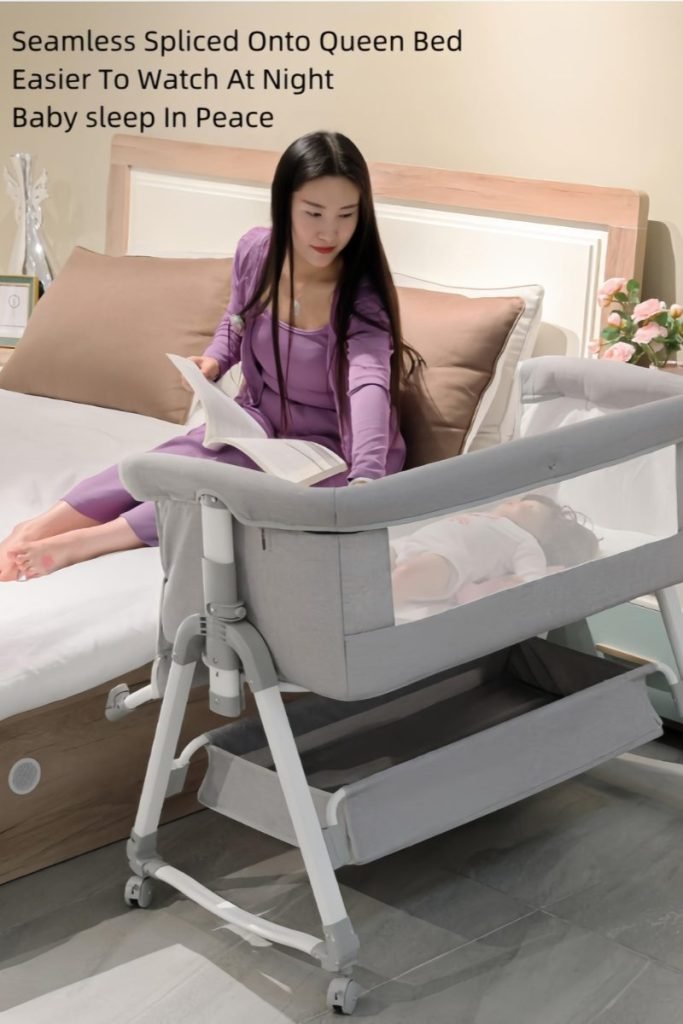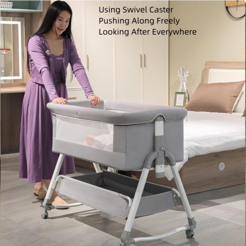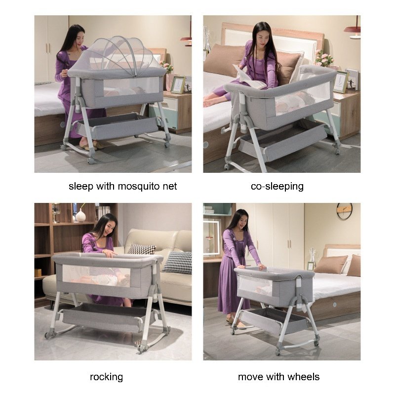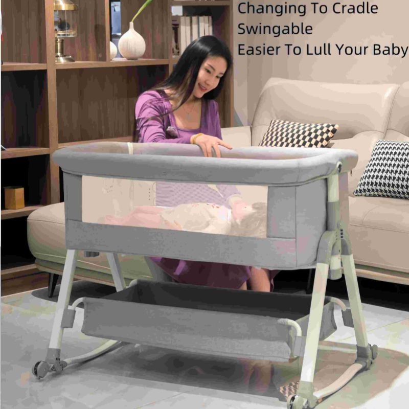 This multifunctional besides crib is mother’s best assistant.Moms can lull babies with the cradle.Infant aiso can be pushed along freely.When babies are sleeping,mothers can splice them onto the big bed